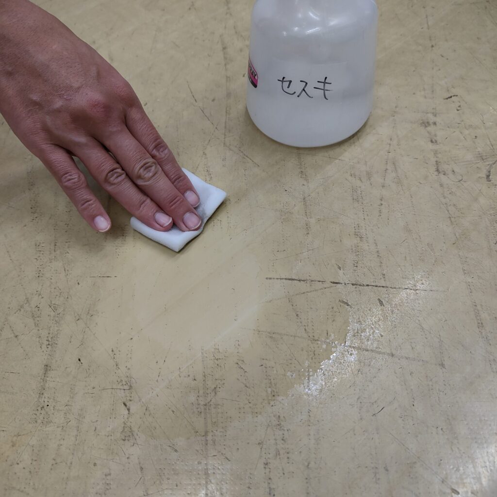 毎回大変ではあるものの、伝統を守りつつやって参りましたが、体力と精神力の衰えから途中Chat GPTに相談したところ、水だけよりセスキ炭酸ソーダを勧められ使ったところ、汚れ・古いワックス落とし効率がグンとUPし、スタッフからも喜びの声を多数頂きましたが、8割方終わりかけていたため微妙な空気感も漂いました。